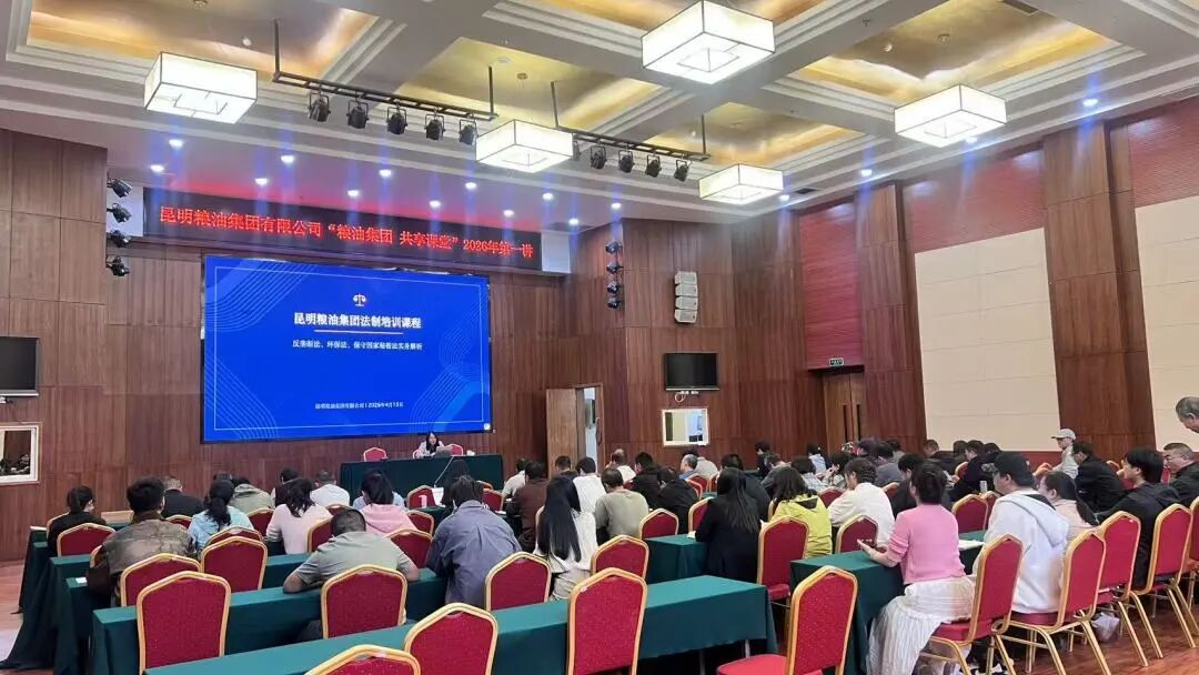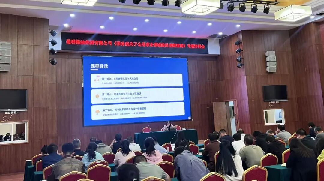 2026年4月13日,姜亚莉律师为昆明粮油集团有限公司开展反垄断法、环保法及保守国家秘密法专题培训,集团管理层及采购、销售、生产、管理等关键岗位人员参加。