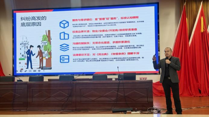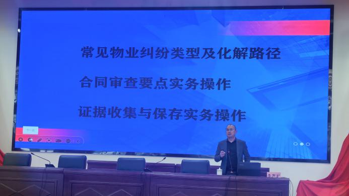 李声扩律师围绕物业纠纷化解、合同审查实务、证据收集与保存三大核心展开讲解。针对物业服务质量、费用争议、停车矛盾、业委会履职等高频问题,解读《民法典》及《物业管理条例》,明确权责边界与多元化解路径。同时,结合租赁合同、物业服务合同、集体资产合同等,讲授审查要点与风险防控技巧,并详解证据固定、合法取证及非法取证红线等实操规范。