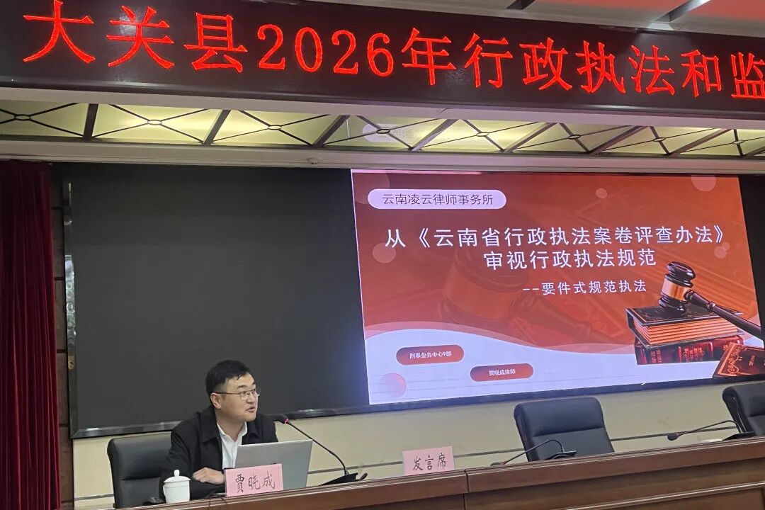 2026年4月14日,受昭阳区政府、大关县政府邀请,凌云律师事务所战略委员会主席耿国平律师、劳动与社会保障业务委员会副主任贾晓成律师为两地行政执法人员开展专题法制讲座,助力基层法治政府建设与执法规范化提升。
